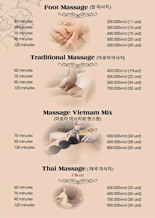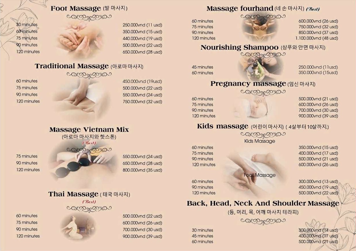+ Gói massage 120′ sẽ được nhận hoặc thả tại hội an miễn phí từ hai người trở lên, và bà nà.