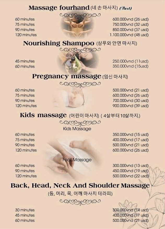 Khi bạn đặt lịch trước bạn sẽ được Áp mã giảm giá 20% trên menu. Sau massage sẽ phục vụ miễn phí cà phê và nước uống miễn phí.